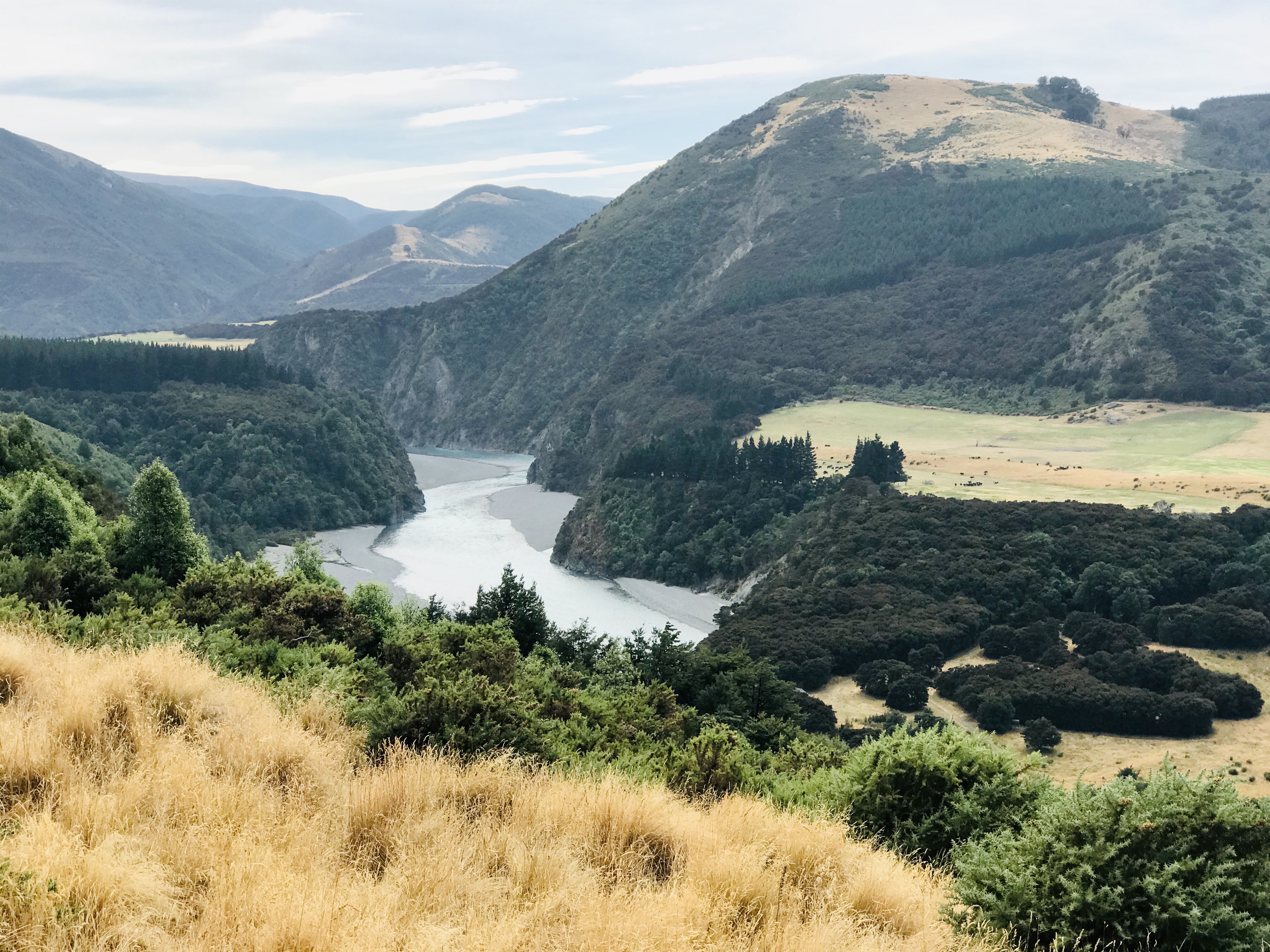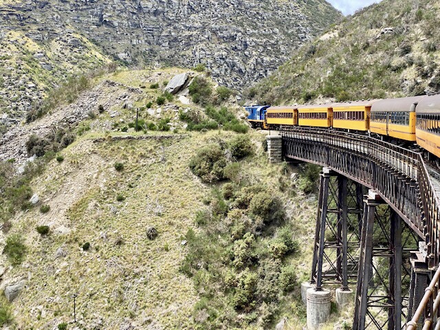 Today we rode on the Dunedin train through the Taieri River Gorge. The weather was lovely all day, but it started to drizzle on the way down, and it turned cloudy and cold—about 55 degrees. I know 55 isn’t that cold, but we thought it would be hot since it’s the middle of the summer here, so we brought only hot weather clothes. Doug has already gone shopping to buy a long-sleeved shirt and a windbreaker. I have one jacket and one sweater with me, and they are getting quite a workout.